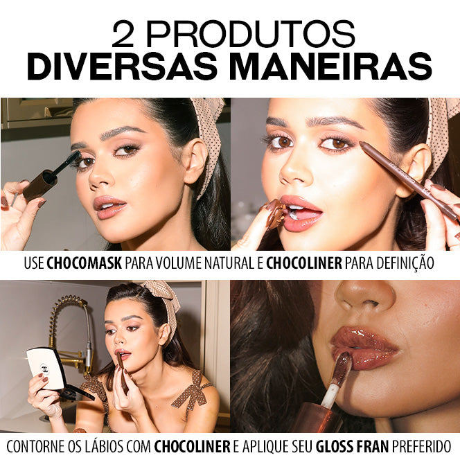 Elegância do tom chocolate para olhos e lábios. CHOCOLINER: lápis multifuncional e apontável, ultra pigmentado, à prova d’água e de longa duração. Faz delineado perfeito, efeito esfumado incrível e ainda define os lábios como contorno. CHOCOMASK: alonga, curva e define os cílios enquanto nutre e hidrata com ceras e Vitamina E.